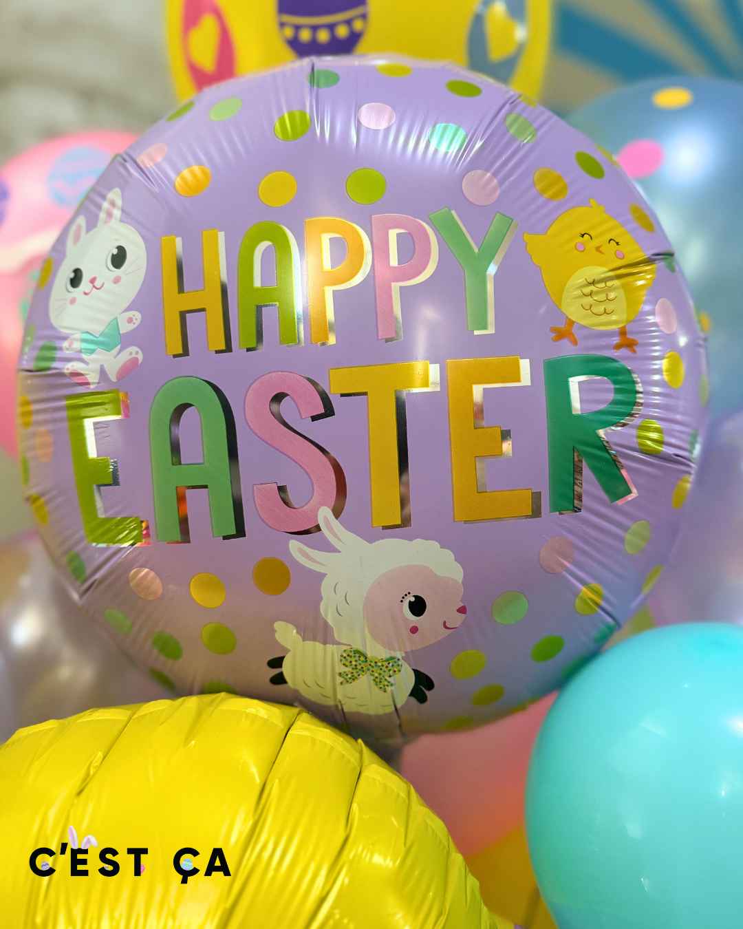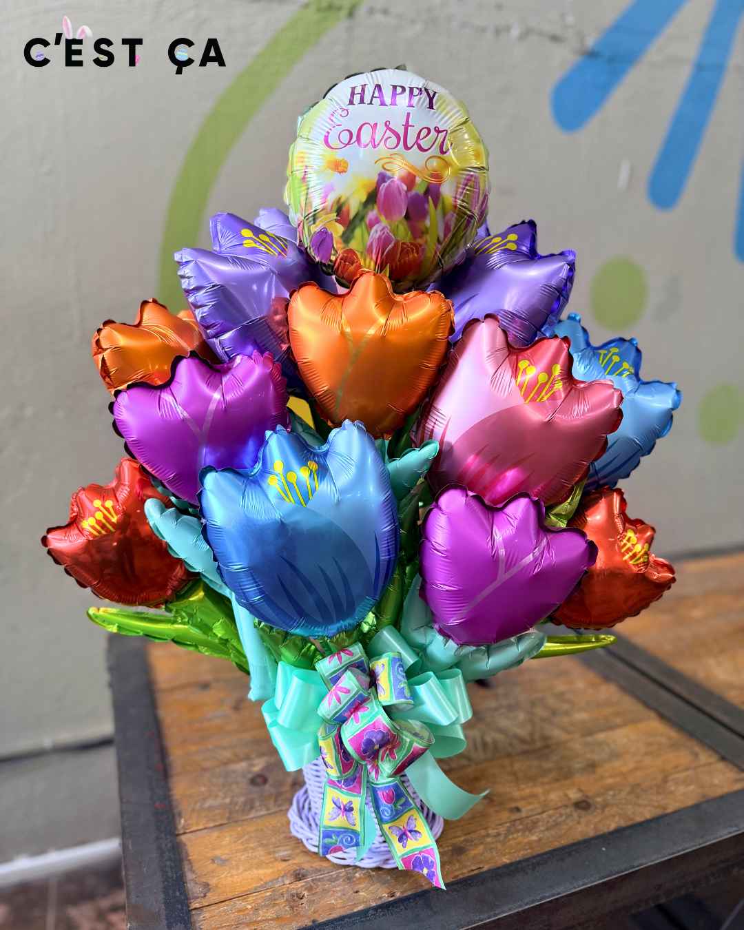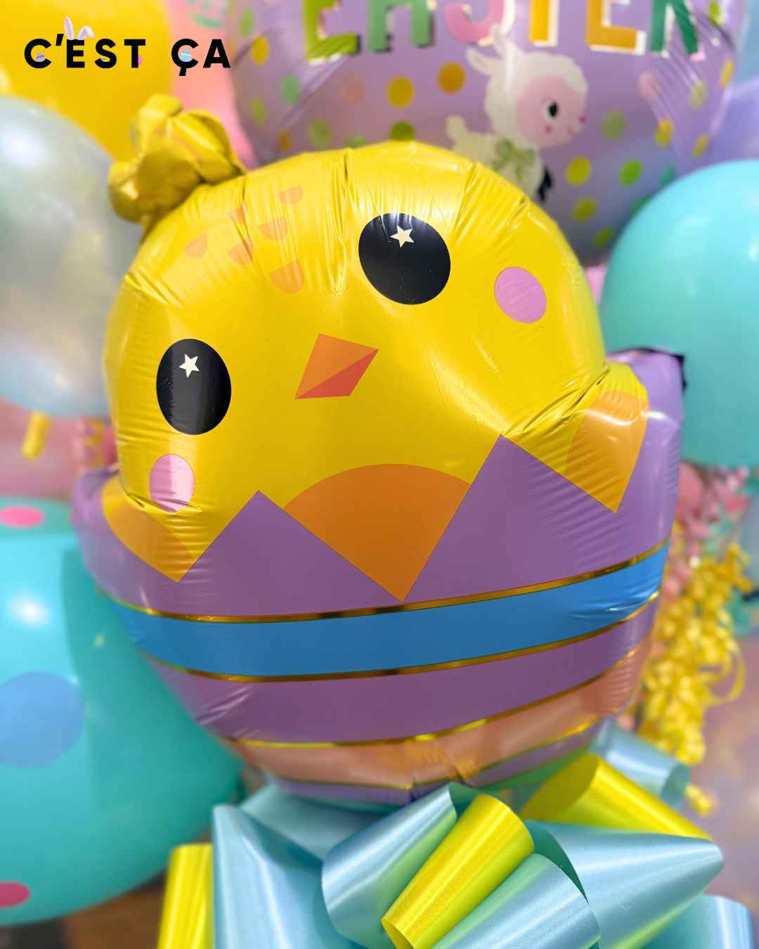 Celebrate Easter with a burst of color and joy! 🐣🌸 This cheerful balloon bouquet features a cute chick hatching from an egg, surrounded by pastel balloons and a festive Happy Easter centerpiece—perfect for brightening homes, parties, or gifting someone special.