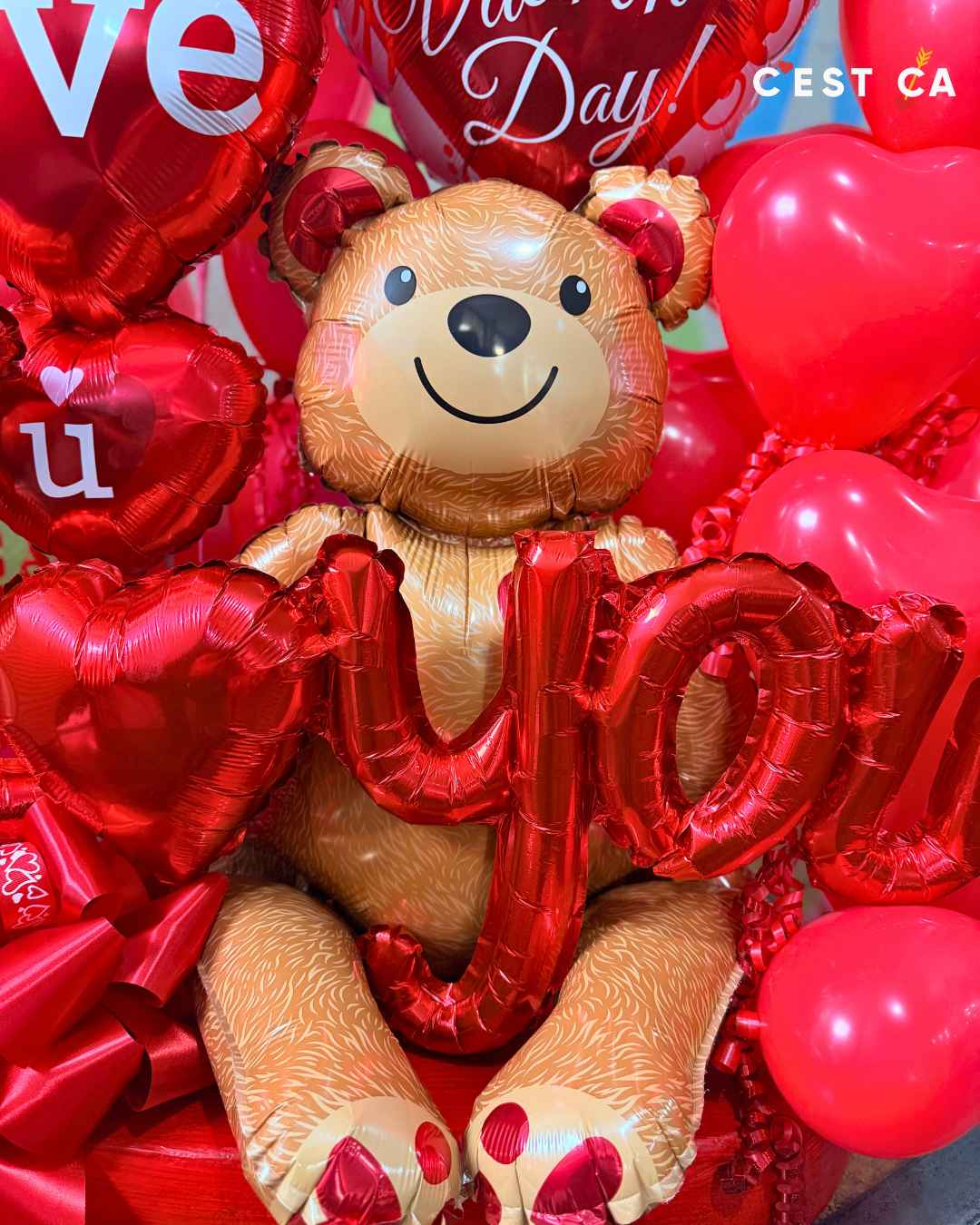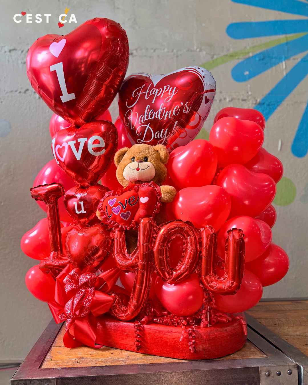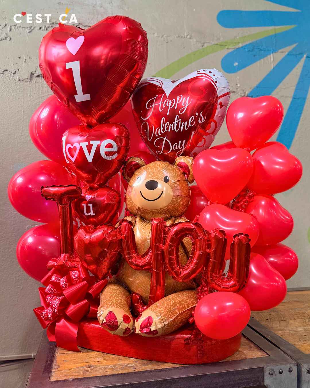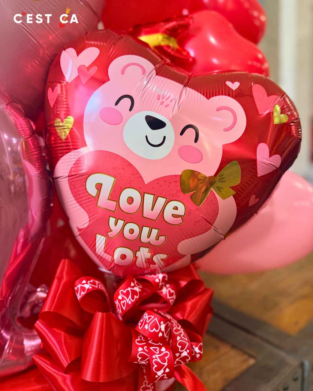 Layers of love! Heart balloons, Valentine wishes, and a teddy that says it all.