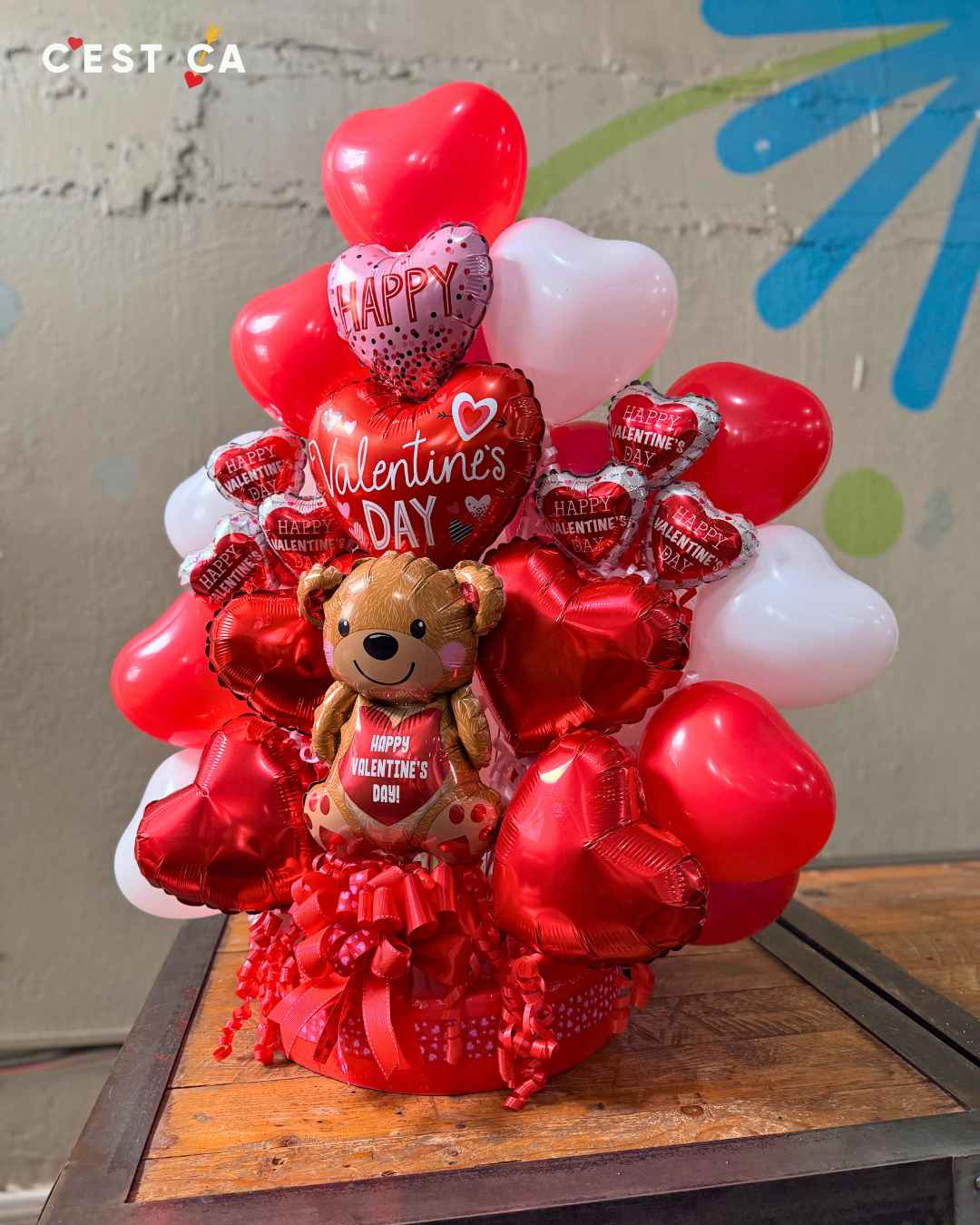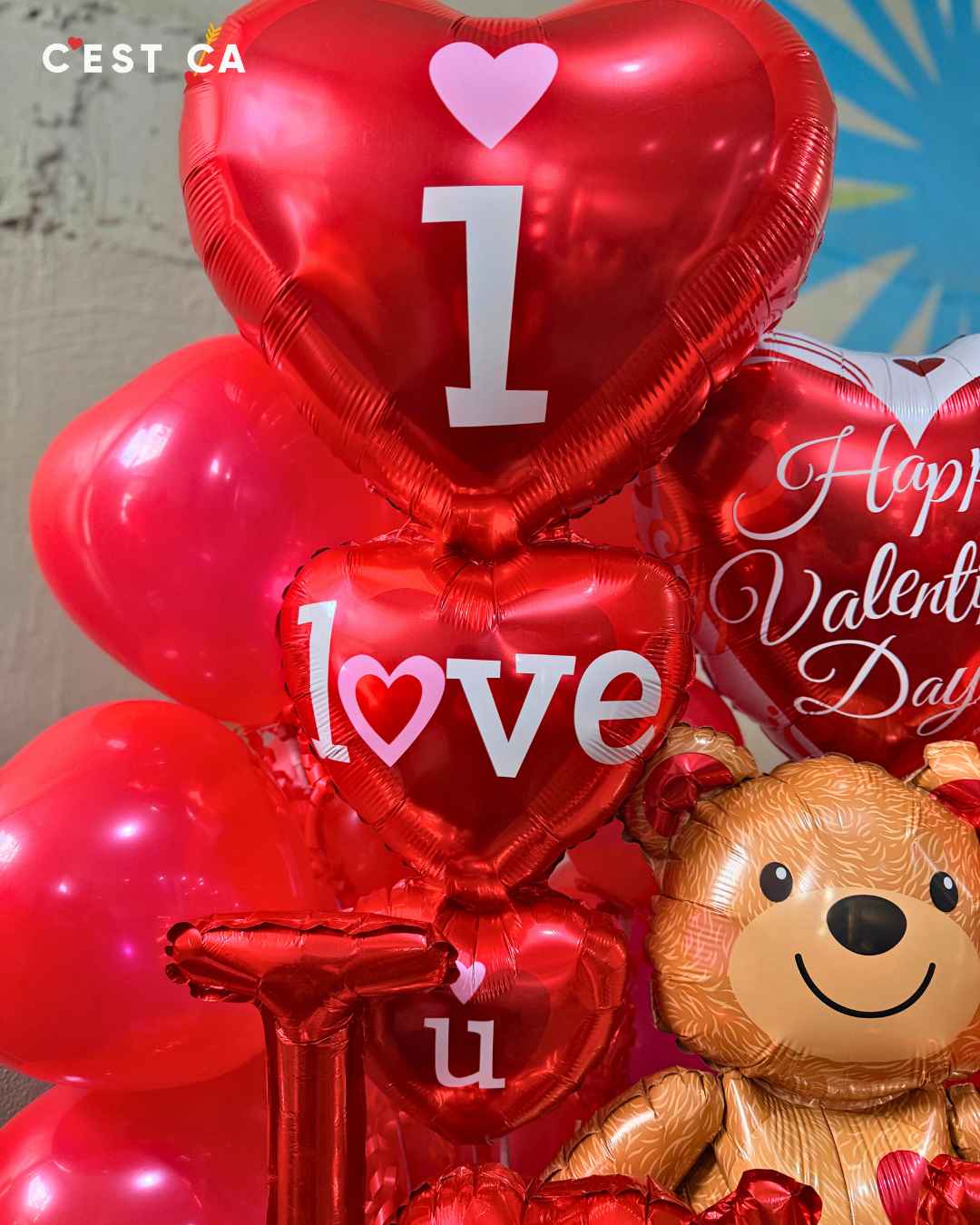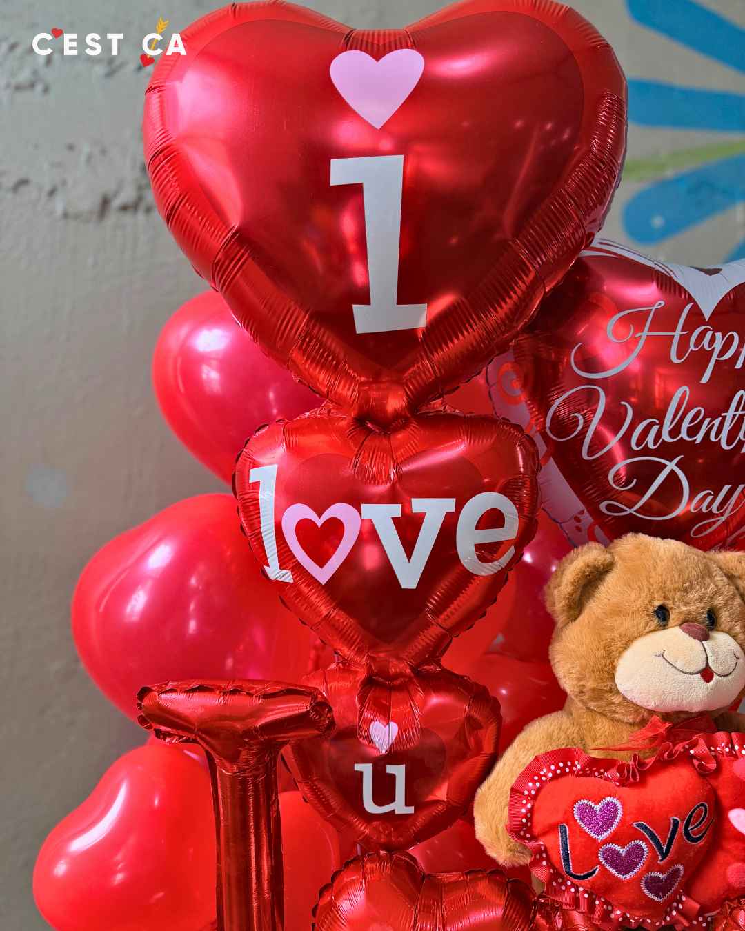 Layers of love! Heart balloons, Valentine wishes, and a teddy that says it all.