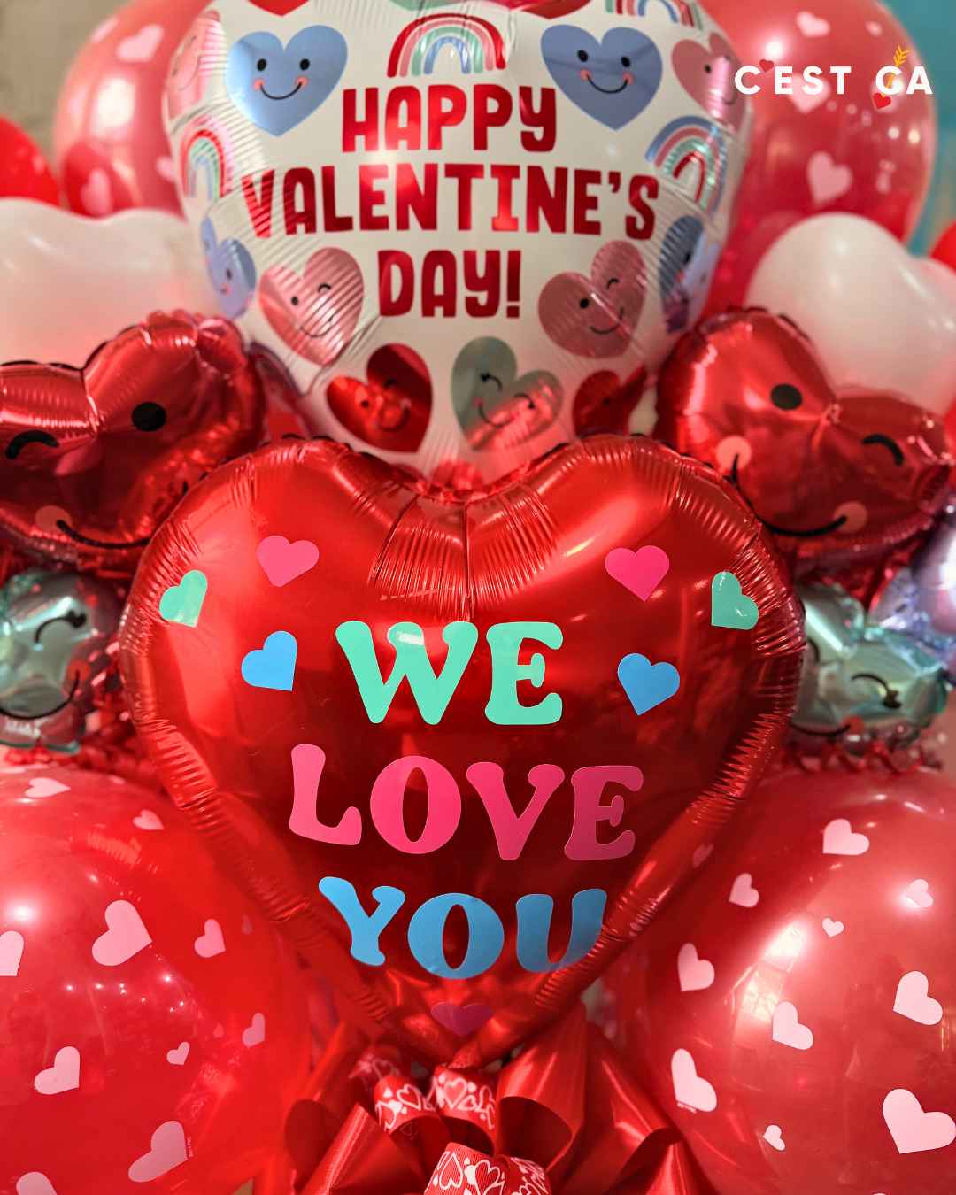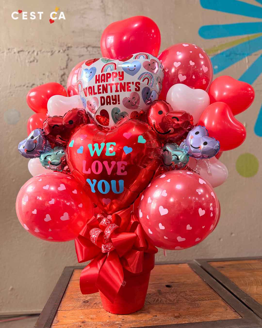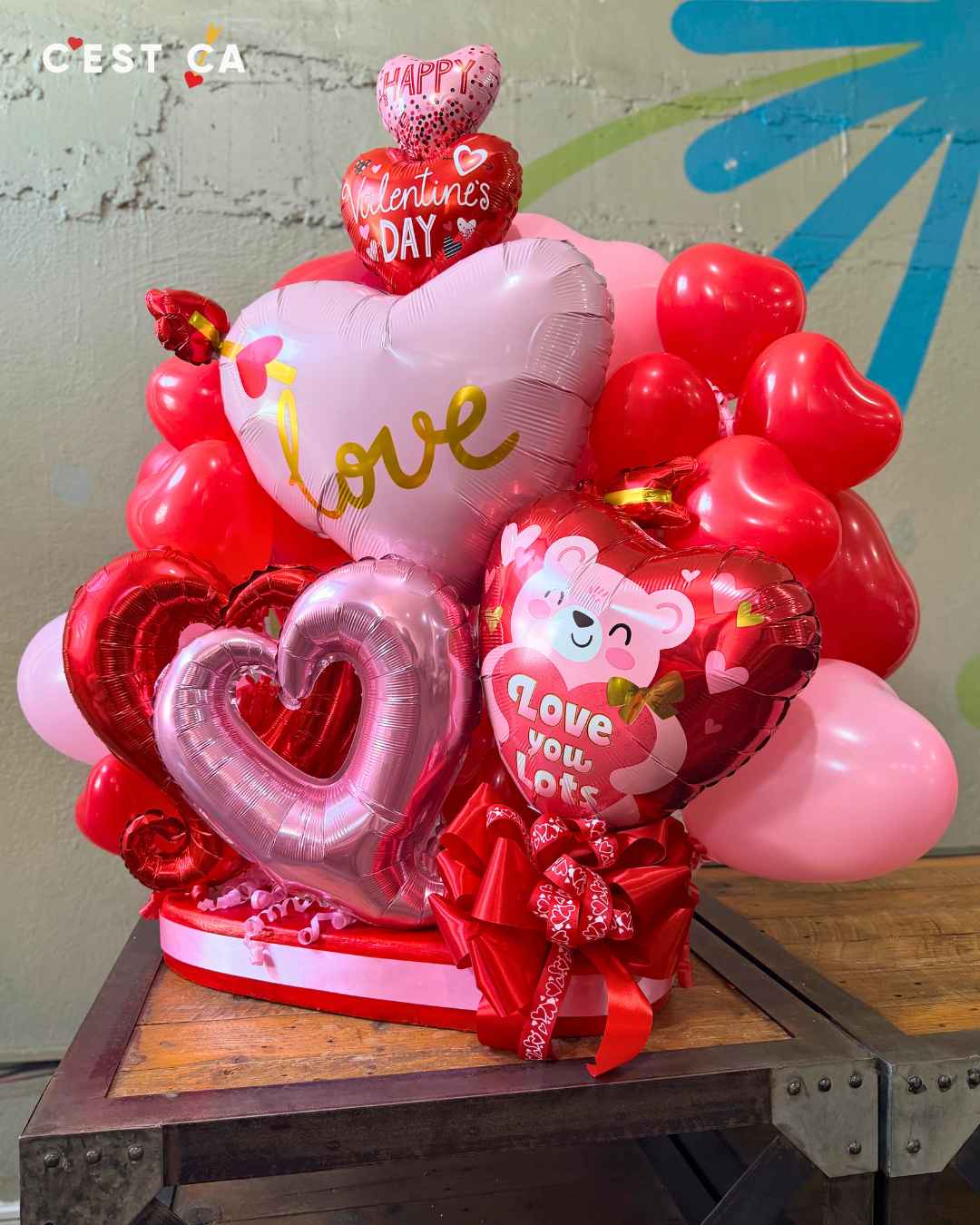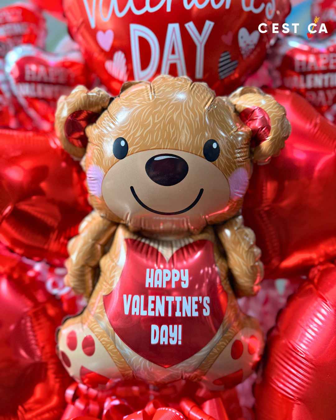 Layers of love! Heart balloons, Valentine wishes, and a teddy that says it all.