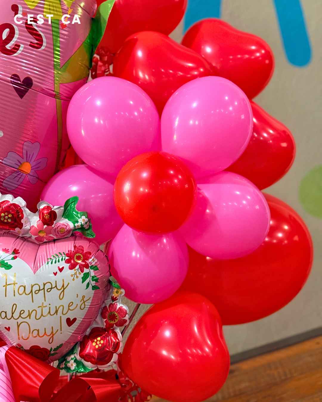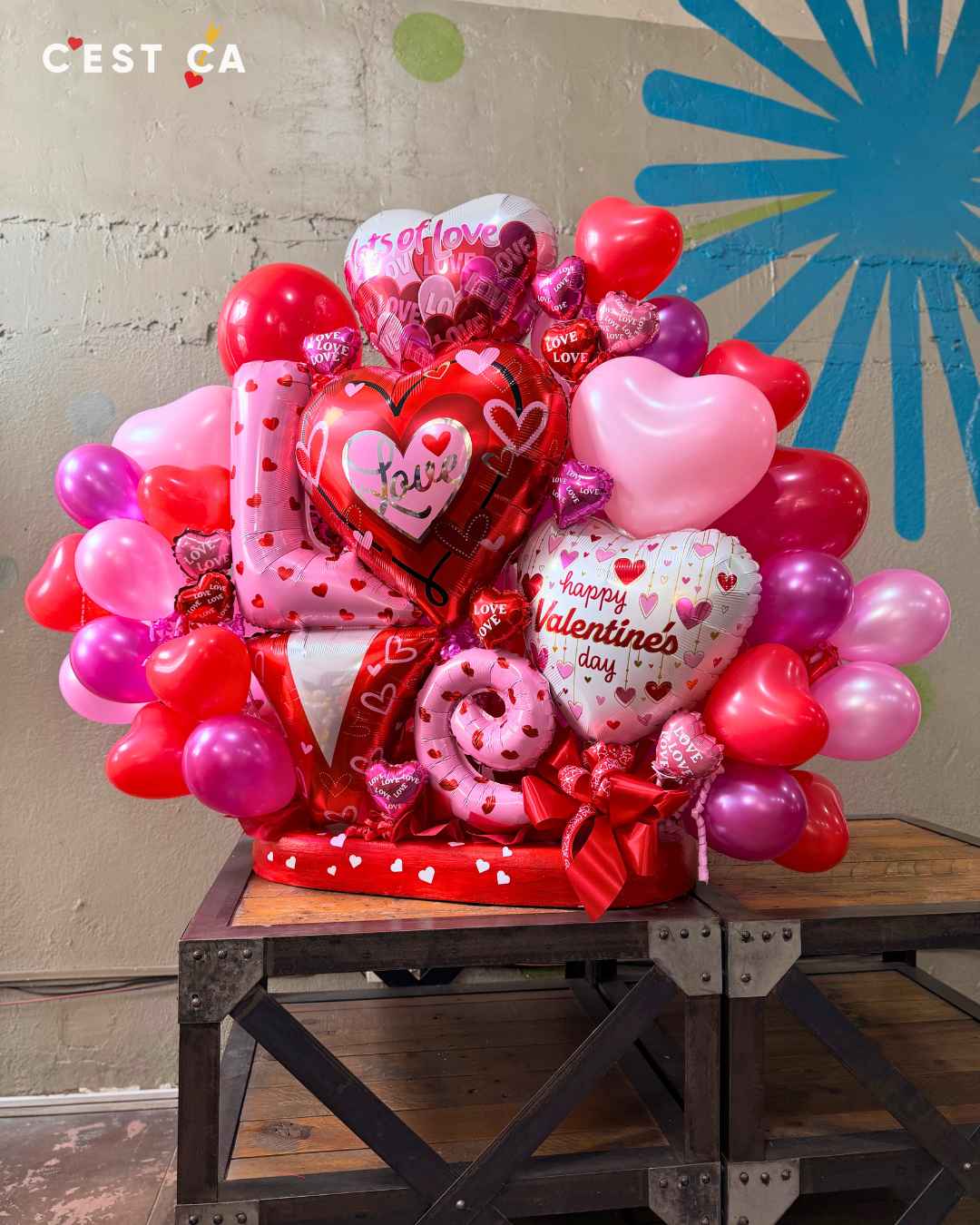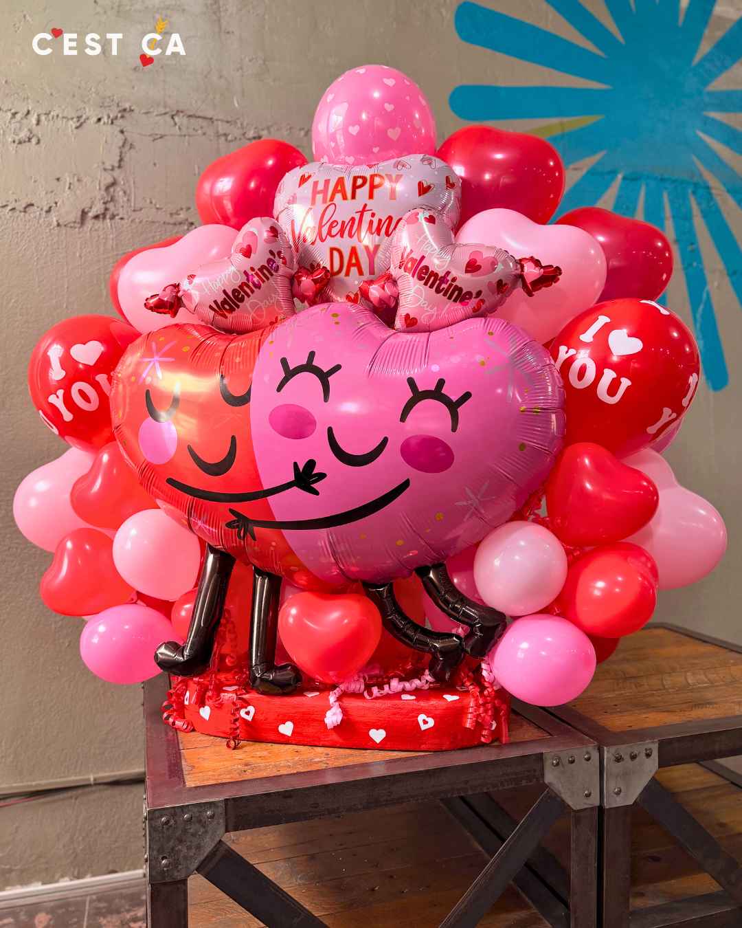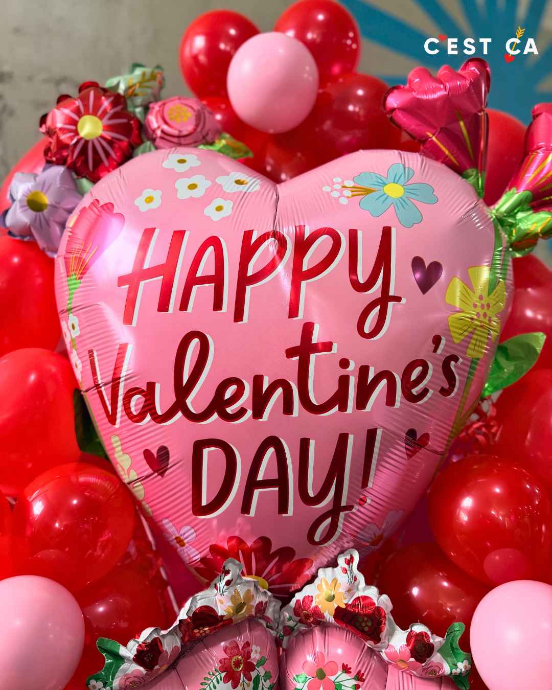 Love should be felt all around. A giant Happy Valentine’s Day heart with florals at the center, surrounded by heart-shaped balloons and sweet Valentine accents.