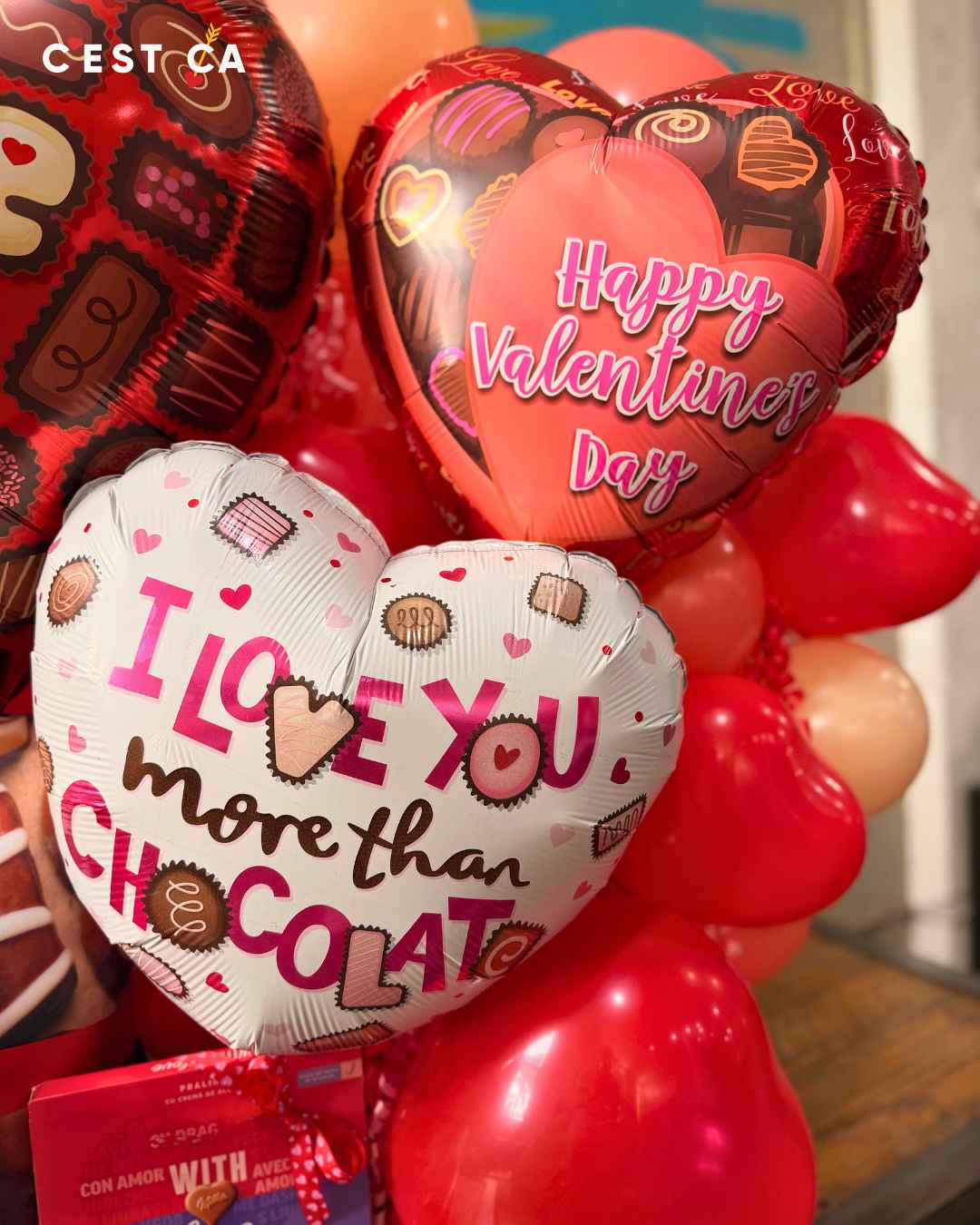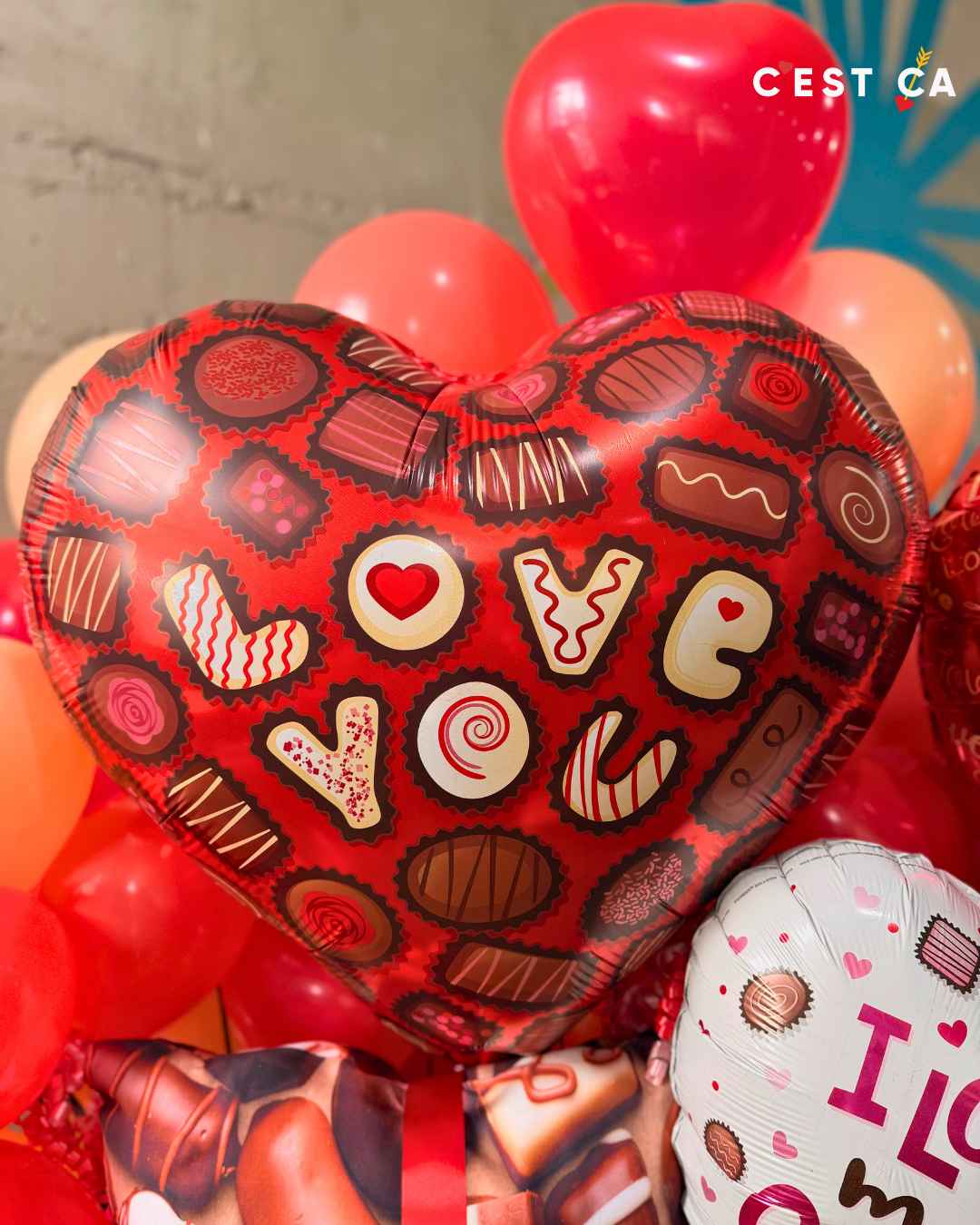 Because love should be sweeter than chocolate! Hearts, chocolate-themed throw pillow and balloons, a box of chocolate pralines, and all the Valentine indulgence.