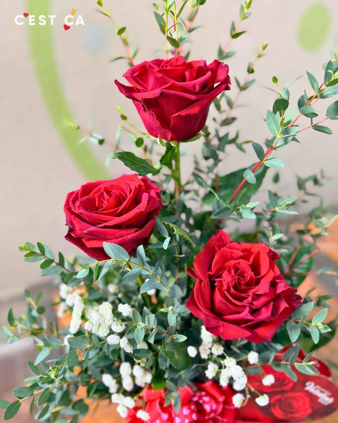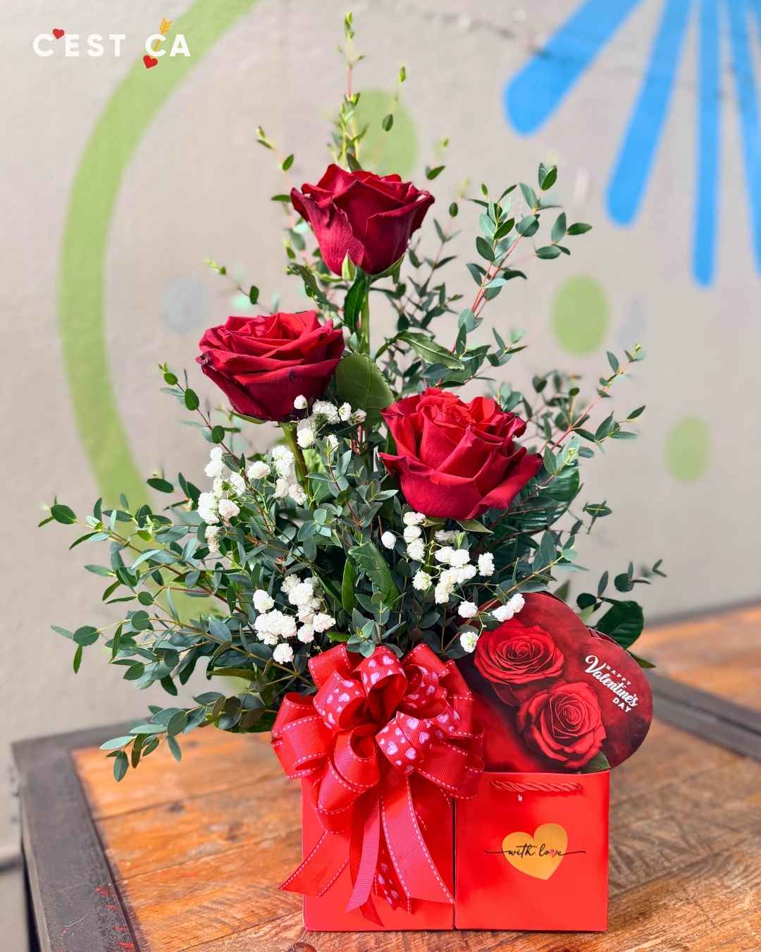 Three Ecuadorian red roses nestled with eucalyptus and lush foliage, sweetly styled in a Valentine’s themed bag and paired with a heart-shaped box of chocolates for an easy, love-filled gift.